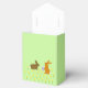 This awesome favor box features a pair of cute little Easter bunnies surrounded by yellow daffodil flowers. The rabbits are brown with big ears, black eyes and fluffy white tails. One of the bunnies is holding an Easter egg with a pretty purple bow on it and is reaching out to offer it to the other bunny. The daffodils are yellow with a bright orange center.