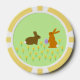 This awesome set of poker chips features a pair of cute little Easter bunnies surrounded by yellow daffodil flowers. The rabbits are brown with big ears, black eyes and fluffy white tails. One of the bunnies is holding an Easter egg with a pretty purple bow on it and is reaching out to offer it to the other bunny. The daffodils are yellow with a bright orange center.
