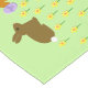 This awesome table runner features a pair of cute little Easter bunnies surrounded by yellow daffodil flowers. The rabbits are brown with big ears, black eyes and fluffy white tails. One of the bunnies is holding an Easter egg with a pretty purple bow on it and is reaching out to offer it to the other bunny. The daffodils are yellow with a bright orange center.