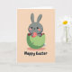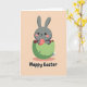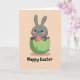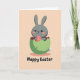 This card shows a soft gray bunny 🐰 with a round face, big dark eyes, and blush-pink cheeks peeking from a cracked green eggshell, as if shyly greeting someone it cares about. Its long ears stand up tall, and the gentle tilt of its head adds a sweet, friendly tone to the scene. In its little paws it holds a red egg decorated with fine white patterns, like a small gift meant for a close friend. A fluffy white tail peeks out behind the broken shell, adding a cozy touch. The background is a muted peach color with soft, diffused lighting, and a faint shadow under the shell helps the character feel grounded. Centered below the illustration, the words “Happy Easter” appear in a rounded style, set in a darker tone that stands out clearly against the peach. The green shell pieces angle outward, with jagged edges framing the bunny while the patterned egg sits bright red at the center 🌷.