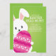 Our cute Easter egg hunt bunny rabbit Easter party invitation features the cutest bunny rabbit holding an easter egg set on a spring green background. Customize with your personal information & you're all set to go.