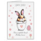 Cute Easter bunny with Easter egg and pink flowers Card. Text can be personalized for Birthday. Easter bunny symbolize renewal, abundance and good fortune.