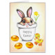 Cute Easter bunny in a plant pot and golden eggs on light beige background Card. Text can be personalized for Birthday.
