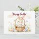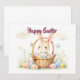 A charming Easter illustration featuring a cute bunny sitting in a woven basket surrounded by pastel-colored eggs and spring flowers. The soft watercolor style creates a warm, joyful atmosphere perfect for Easter greetings.