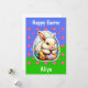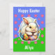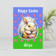 Happy Easter Card featuring an adorable Easter bunny illustration in bright colors, ideal for younger children. With a cute pink flower pattern on a background depicting a green grassy lawn and blue sky. You can change the text on the front and back.
