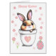 Cute Easter bunny plant pot with Easter egg and pink flowers Card. Text can be personalized for Easter or Birthday. Bunnies symbolize longevity, abundance and good fortune.