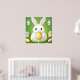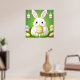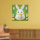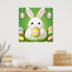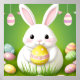 Holiday-themed illustration featuring a cheerful white bunny surrounded by colorful Easter eggs and grass.