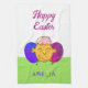 Cute Easter Chick and Eggs Happy Easter Holiday kitchen towel. Cute chick with cracked eggshell on the head and one blue and one purple Easter egg.
