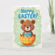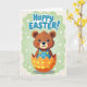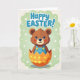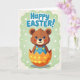 This design shows a cute brown bear-like youngster peeking out from a cracked, decorated eggshell, as if greeting a friend with a shy, welcoming look 🐰. Its rounded face has wide blue eyes with tiny highlights, rosy cheeks, and a small dark nose, giving it a gentle, affectionate presence. The little character wears blue overalls with two golden buttons, adding a cozy, country touch. Behind it, a pastel green background rolls in soft waves, bordered by thin multi-stripe bands in light, springtime colors. Small white circles float across the green like drifting petals 🌷, making the scene feel light and airy. Near the top, the words “Happy Easter!” sit centered in thick blue lettering with a white outline, standing out clearly against the pale backdrop. Below, the broken eggshell is warm orange with repeating light-yellow triangles, with jagged shell edges curving around the character like a snug cradle.