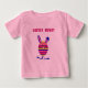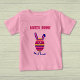 A cute Easter bunny in the shape of an Easter egg, decorated with spots, stripes and zigzags in pink, blue and yellow.