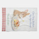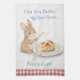 This adorable Easter tea towel features a sweet bunny holding a butter knife beside a freshly baked hot cross bun on a delicate floral plate, finished with the playful caption: