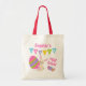A Cute Easter tote bag featuring a bunny rabbit carrying a bright colored Easter egg of pink purple and green stripes and with the word "Easter" in colorful bunting. A fabulous tote bags for kids to use on their Easter egg hunt. Can be personalized by amending the little girls's name .