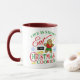 Here's a cute coffee mug that declares "Life is Short. Eat the CHRISTMAS COOKIES". A colorful gingerbread man smiles beside the red and green text. A few blue snowflakes drift down around the image. The image is printed on two sides, with your name or other custom text at the center between them. Holiday fun!