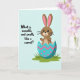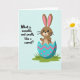 This card shows a long-eared bunny-like character peeking out from a cracked egg, giving a small raised-paw greeting that feels like a friendly hello 🐰. The creature is shaded in warm brown with pink inner ears, shiny black button-like eyes, and fine whiskers that soften its face. The egg shell is turquoise with pink wavy lines and scattered dots, sitting on a small patch of green grass that suggests an outdoor spring moment 🌷. Behind it all is a smooth, pale sky-blue background that keeps the focus on the character and its gentle, welcoming pose. On the left side, a riddle is printed in rounded, curvy lettering: “What is invisible and smells like a carrot?” The text is set in dark ink for strong contrast against the light background, spaced to balance the bunny on the right. The simple shapes and flat color areas give the scene a tidy, modern look while the bunny’s sweet expression adds a touch of closeness, like it’s sharing a private joke with someone special. The turquoise shell’s pink patterns curl around the crack where the bunny pops out, with the grass tucked neatly along the bottom edge.