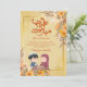 A heartwarming and cute illustration of a young Muslim boy and girl sharing a meal. Surrounded by warm autumn-toned flowers, this card is perfect for children, family members, or students during the holiday season.