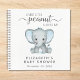 Cute guest book for your baby boy shower with "A Sweet Little Peanut Is On His Way" written in a mixture of soft grey typography and a stylish script, and a pastel blue watercolor of a baby elephant. Personalize the mother-to-be's name and the shower date in simple grey typography.
