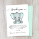 Cute gender-neutral baby shower thank you card featuring "thank you" in a stylish grey script with swashes and a pastel mint green watercolor of a baby elephant. Personalize your thank you message and add your name(s) in a signature script, or leave blank for a handwritten note.