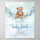 A watercolor illustration of a cute teddy bear surrounded by a eucalyptus wreath, swing, and dusty blue flowers sets a charming tone for a boy baby shower. This artwork could be a delightful addition to a "Guess The Baby Food" game sign. The soft colors and whimsical elements create a sweet and inviting atmosphere, perfect for celebrating the upcoming arrival of a baby boy.