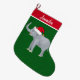 This beautiful Christmas elephant stocking features a cute smiling elephant wearing a red Santa hat with a raised trunk. This pretty personalized animal Christmas stocking is decorated with a lovely green holiday background. Personalize with your own text at the bottom for a classy gift.