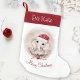 Perfect! Exactly what I ordered! I uploaded a picture of my blue chow, and the screen print was incredible. the back side of the stocking was the red and black checkered print. my puppy's name was also printed on the cuff of the stocking. PERFECT! Highly recommend this product! My puppy's name was screen printed onto the cuff of the stocking, the font was perfect!