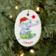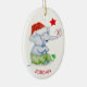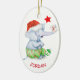 This cute Christmas kids' ornament features an adorable watercolor gray elephant who wears green and red striped pajama bottoms and a red Santa hat. He offers a gift tied with a red ribbon. A red star shines above him, and a green and white tree bulb is at his knee. Your child's name is in red at the bottom. The back has four text fields in red and green for you to customize. Cute for a grandparent to give to a grandchild, or a parent to give to a daughter or son.