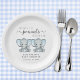 Cute paper plates for your twin boys baby shower with "Two Sweet Little Peanuts Are On Their Way" written in soft grey typography and a stylish script with swashes and blue watercolors of twin baby elephants. Personalize the mother-to-be's name and shower date in simple grey typography.