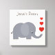 A very cute illustration of a simple minimalist cartoon elephant trumpeting red hearts out of his trunk against a light grey background. This cute and whimsical design would be perfect for a kid's room or child's play area or for anyone who loves cute elephants. The text is customisable for you to include the child's name for a room art or kid's room décor.