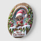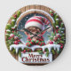 This charming clock features a cute elf with large pointed ears and a striped hat, peeking out from a snowy round window set into a rustic wooden wall. The window is framed by a generous wreath of pine boughs, holly, and red ornaments, with a sign below reading "Merry Christmas." The design may look real due to the high detail and three-dimensional texture in the artwork.