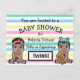 Here are cute hand drawn baby boy and boy and girl twins Baby Shower invitations. Personalize these by adding your party's information in the personalize area. Pink, blue, green, purple and tan stripes in the background with a cute boy and girl baby twin in each corner. These postcard invitations are a very affordable way to get pre made personalized baby shower invitations. These babies represent African-American babies.