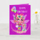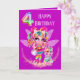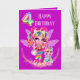 A beautiful and magical blue eyed fairy girl with long rainbow colored hair and matching outfit is holding an ice cream cone and the cutest little unicorn handbag. She is standing on a faux shiny and sparkling trail of fairy dust that is set against a pretty purple background that has the words, happy birthday on it and a rainbow colored numeral four. These are ideal for your daughter, granddaughter, goddaughter or niece on their 4th (forth) birthday.
