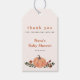 Cute fall themed baby shower thank you gift tag featuring a charming design with a pumpkin on a wildflower and greenery bouquet.