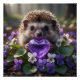 A cute hedgehog holding a purple amethyst heart sits in a patch of violets in a serene forest.