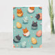 This card features a repeating pattern on a soft aqua background, filled with stylized cats peeking out from cracked decorative ovals as if they’re shyly greeting one another. Some cats are striped orange and others are charcoal gray, with closed eyes and small smiles that suggest a tender, friendly calm. Between them sit smooth, uncracked oval shapes decorated with stripes, polka dots, and tiny hearts, creating little moments that feel like quiet affection. The colors stay gentle and pastel—soft coral, muted blue, creamy white, and warm yellow—so the whole scene feels light and airy, with a subtle romantic softness in the way the faces seem to “lean” into the pattern. Small star shapes sprinkled around in white and blush pink add extra sparkle across the background, alongside a small touch of spring flair 🌷. There’s no main character or single scene; instead, the repeating layout makes it feel like an ongoing exchange of sweet glances, like friends sharing a private joke. No text appears on the front, leaving the aqua space and the pastel ovals to carry the design 🐇, and the tiny stars dot the gaps between the ovals in a scattered, even rhythm.