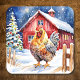 Cute Christmas coaster with a watercolor style chicken standing by a rustic wood fence in front of a barn.