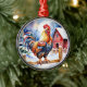 Cute Christmas ornament with a watercolor style chicken standing by a rustic wood fence in front of a barn.