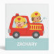 Sound the alarm! This cute cartoon design has a little fire fighter boy driving a little red fire truck which has a yellow ladder on its side. A little fire fighter puppy dog at the back of the trunk is preparing a hose to extinguish the fire. Colourful, cheerful and bright, personalise with child's name to make a special and unique gift for the boys!