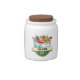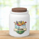 This personalized candy jar features a yellow and red firefighting airplane spraying water over a happy forest with cheerful trees and clouds.