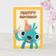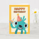 Cute first birthday greeting card for a toddler. A smiling character is wearing a birthday hat and holding a piece of birthday cake with one candle for the special 1st birthday event. Art, image, and verse copyright © Shoaff Ballanger Studios, 2022.