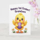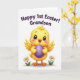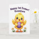 This card features a fluffy yellow baby bird centered on a white background, with big dark blue-black eyes, tiny lashes, and rosy cheeks that give it a sweet, affectionate look. Its small orange beak sits slightly open, as if it’s chirping to someone close by, adding a gentle, friendly tone to the scene. The bird holds a rich purple egg with thin white stripes and small decorative marks, tucked carefully between its wings like a little gift. Near its feet, two simple white daisies with bright yellow centers and slim green stems add a spring touch 🌷. Above the bird, dark purple cursive lettering arches across the top, carrying a celebratory message about a first milestone. The spacing leaves plenty of white area around the illustration, keeping the focus on the bird and the egg while still feeling airy and calm. The purple text sits high and centered, while the daisies balance the lower corners beneath the bird’s rounded body. The egg’s glossy purple surface shows pale striping and tiny accents, with the daisies placed low on either side like small bookends 🐇.
