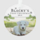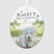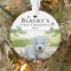 Cute first Christmas puppy photo ornament with Christmas tree branches. The background is white and the text is in trendy typography. Personalize the ornament with your dog`s photo, name and year of birth - insert your favorite puppy photo. You can use this custom ornament for any pet. A great holiday keepsake for you or a gift for your family and friends.