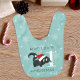 Purrfect festive baby bib for this holiday season. A little black kitty cat in a santa hat playing in snowflakes. Just add your name