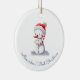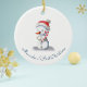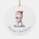 What better way to celebrate your little one's first Christmas than by giving them a spot on the Christmas tree? This adorable ceramic ornament, featuring a little snowman in a red Santa hat and clutching a big candy cane, can be personalized with your own text to make it truly one-of-a-kind. The back of the ornament is decorated with a pattern of white snowflakes against a light blue background, adding a touch of wintery whimsy. Illustrated and designed by Patricia Alvarez.
