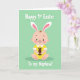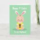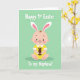 This card shows a cute baby figure centered on a soft pastel green background, smiling gently with rosy cheeks and small dark eyes that seem to meet yours with friendly warmth. Long bunny ears with white edges and pink inner panels sit on its head, adding a springtime touch 🐰. The baby wears a sunny yellow outfit with a white rounded collar and matching cuffs, keeping the look sweet and tidy. In its small hands, it holds a dark brown little animal figure close to its chest, like a treasured gift shared between family members. White lettering in a rounded, easy-to-read style sits above the character reading “Happy 1st Easter,” while matching white text below reads “To my Nephew!” 🌷. The lighting is flat and soft with almost no shadows, giving the illustration a calm, gentle feel. Tiny pink paw-print shapes decorate the soles of the baby’s bare feet.