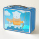 Adorable lunch box , for young children , featuring a polar bear coming back from a fishing trip . Choose the box color and personalize it with your child's name . Find the matching water bottle .