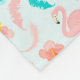What a cute fleece blanket for a newborn, toddler, or small child! It features a pink flamingo mom and baby at the center of a turquoise blue and pink lined ornate white banner. Below the image of the two birds is your child's name in matching teal. The banner with the image and text is placed on a pretty background of matching tropical images, including another flamingo, hibiscus flowers, and leaves. In pastel colors, this is a very pretty gift idea, too.
