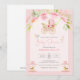 Prity floral pink baby crib with gold wheels and cute floral horse carousels, an elegant baby shower invitation.