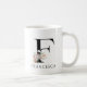 A pretty monogram black initial with pink watercolor floral and palmetto leaves coffee mug, with a stylish serif typeface with pretty curved serif initial in black, and a simple classic type name. Pink on black design. Letter F name monogram. Simply personalize with your name.
