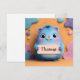 This adorable 3D illustration features a fluffy blue hamster or furry creature with kawaii features. The character has large eyes, pink cheeks, and holds a blank peach-colored sign for custom messages. The background features vibrant orange and soft pastel shapes.