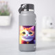 A captivating portrait of a wide-eyed kitten with mesmerizing green eyes. The kitten's soft, fluffy fur is a blend of white and orange stripes, and it wears a regal-looking burgundy collar adorned with a gold medallion. The background is a soft, ethereal purple, further emphasizing the kitten's enchanting gaze.