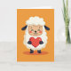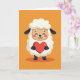 This Valentine’s Day greeting card features a cute sheep standing right in the center of a bright tangerine-orange background. The sheep has fluffy white wool, a light tan face, and dark ears that stick out on each side of its head. Its eyes are closed in soft curved lines, and it wears a wide smile with rosy pink cheeks that give it a warm, happy expression. Held gently in both small black hands is a bright red heart with a tiny white shine that makes it look glossy ❤️. A reddish-orange oval shadow sits beneath the sheep’s feet, helping it feel settled in the scene. There is no text on the front, letting the sheep and heart share the message on their own. It’s a sweet, cheerful card that works well for Valentine’s Day, friendship, or a simple note of love